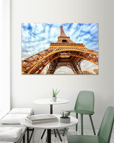 Obraz na płótnie wieża Eiffla widziana od dołu na tle błękitno białych obłoków